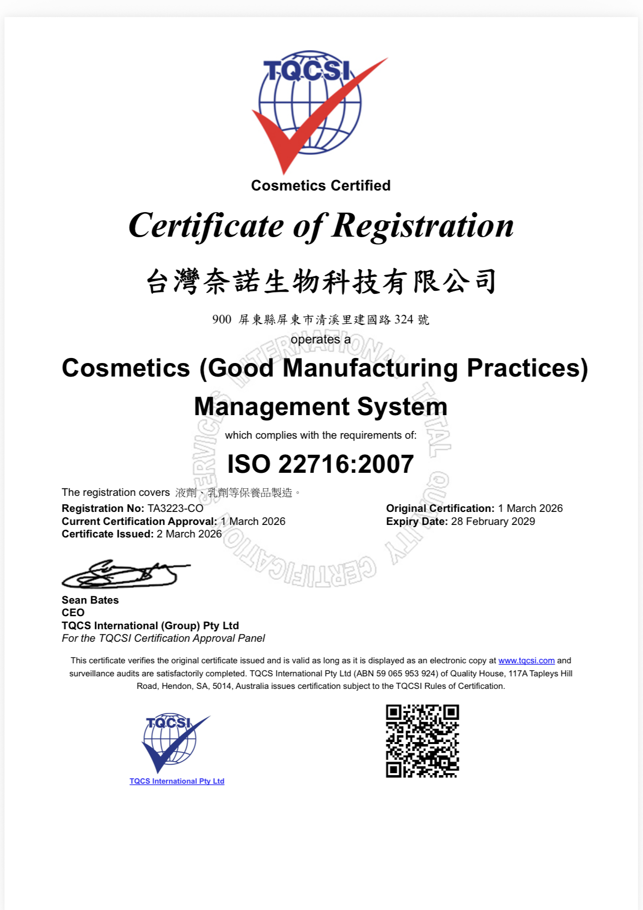 台灣奈諾屏東生技新廠通過ISO22716國際GMP認證